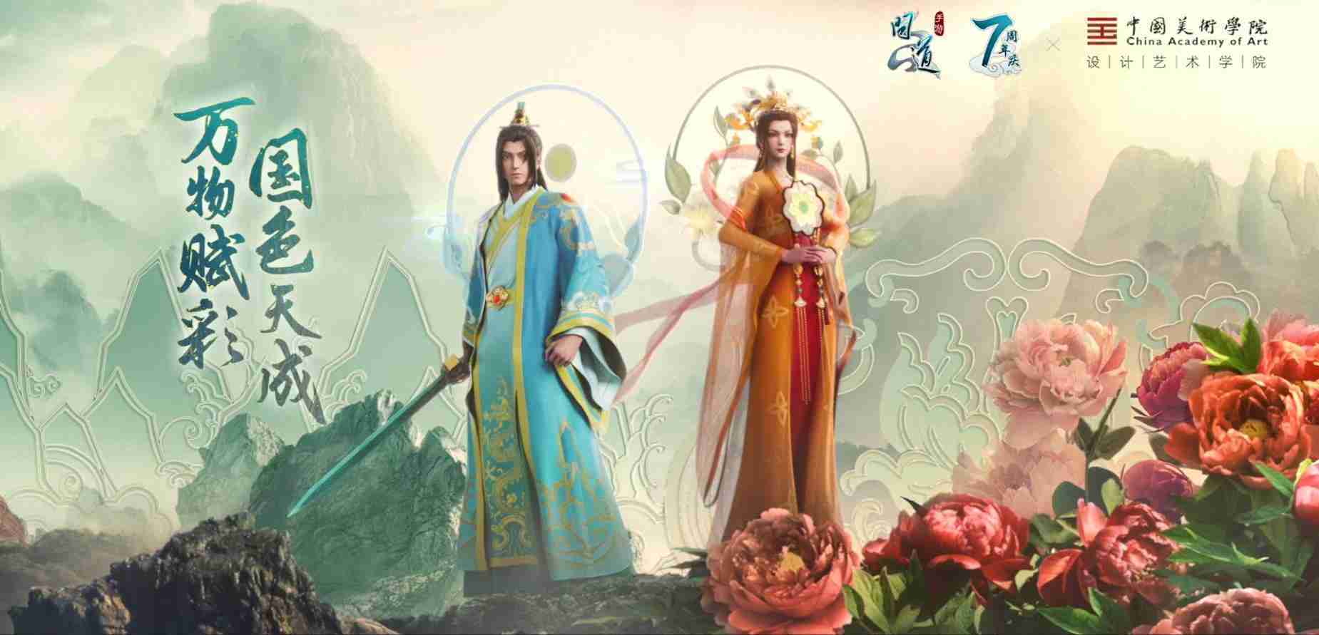 2023年4月,,,,《问道手游》联动中国美术学院,,在游戏中融合了中国历史上不同时期的文化元素,,,打造了“山河万象”与“凤鸣九霄”的国风时装。。。在色彩配置方面,,,创作团队基于对游戏角色特性的分析提取相应的文化内涵,,从每一种色彩的色相、、、指代事物和情感出发对应角色属性,,选定服装的色彩搭配。。。。在纹样设计方面,,,创作团队结合游戏角色自身特殊的造型比例和形态,,在实际的纹样设计中进行了游戏语境下的活化演绎。。。男性角色集中使用了如蟒纹、、、海水江崖纹、、如意纹和云气纹等传统纹样元素,,女性角色则吸纳了凤凰纹、、、、牡丹纹、、、、卷草缠枝纹等元素,,组成以“双凤牡丹纹样”“缠枝牡丹纹”“金玉凤冠头饰”为主要纹样的游戏角色装饰图案系统。。。。